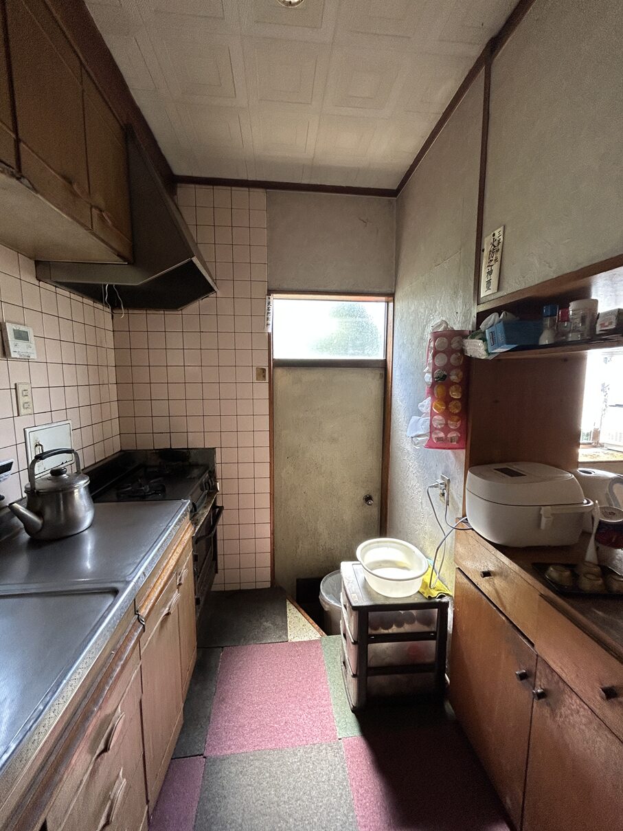 以前のキッチンは、壁面のピンク色のタイルが印象的でしたが、目地の掃除が大変というお悩みも。また、開き戸タイプの収納や勝手口周辺の動線も、少し窮屈さを感じていらっしゃいました。