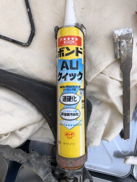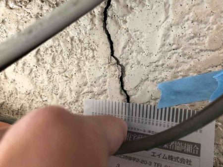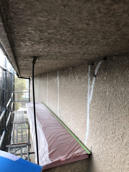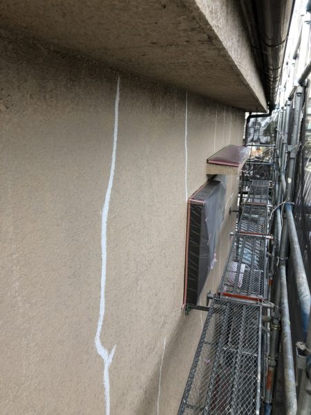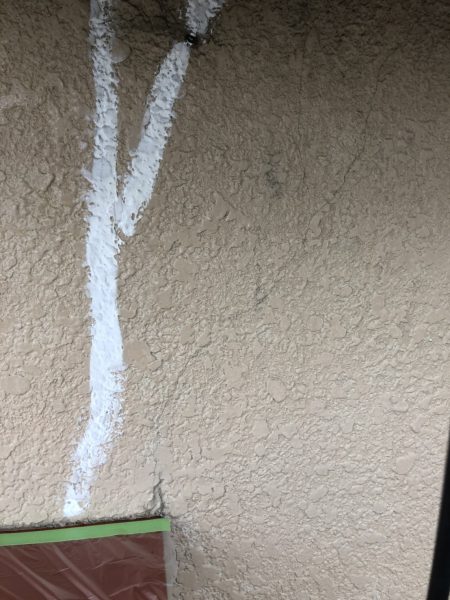 モルタル外壁にてクラックがかなりありますので、このクラックの補修から行っています。アクリル系ウレタンシーリング材AUクイックにてモルタルのひび割れの補修をしています。数が多いので処理忘れなど基本的なことが抜けないようにパトロールでもチェックしました。