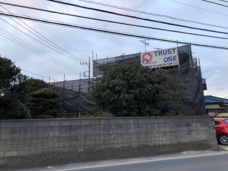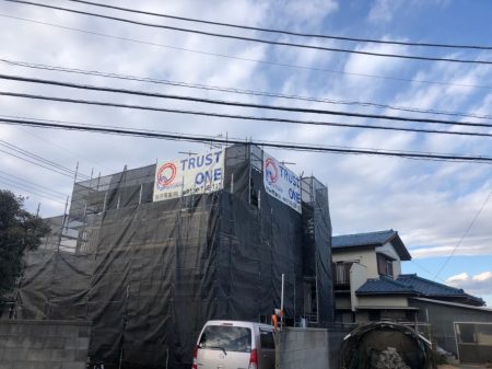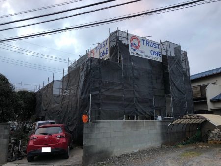 足場を設置しました。シートを緊結してイメージシートを張り高圧洗浄に備えます。