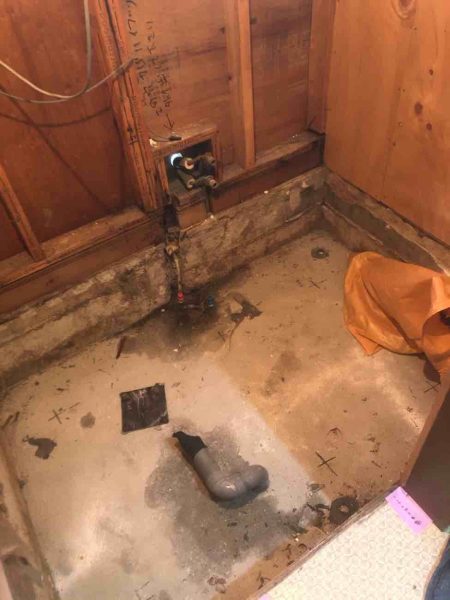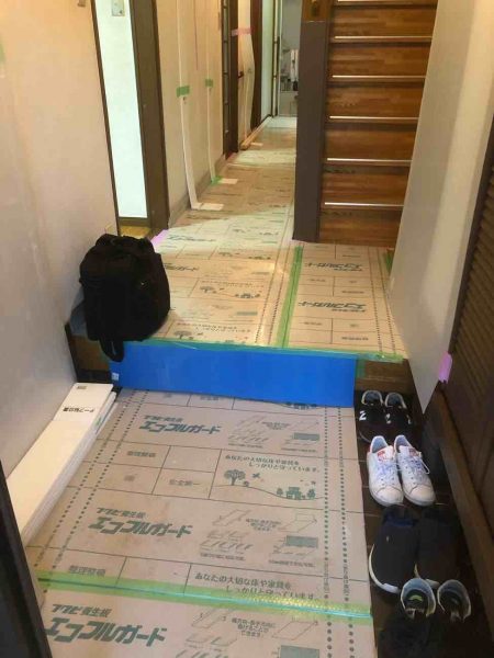 養生を行い、既存浴室解体を行いました。
