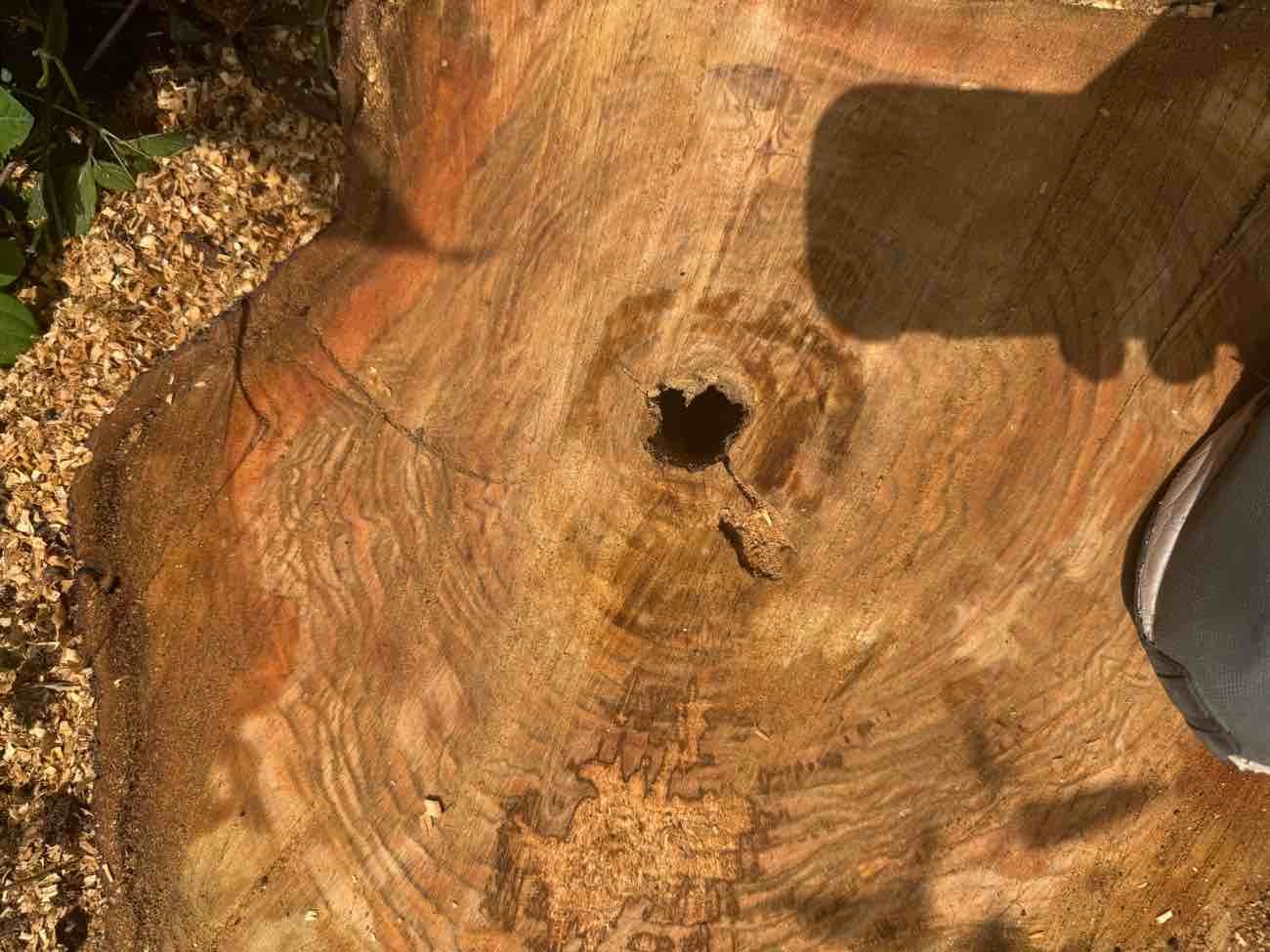 中心部に大きな空洞穴がありカミキリムシの幼虫は木の内部特に心材に近い部分を食害しながら成長します。その結果、幹の中心部にこのような大きな不規則な形状のトンネルや空洞を形成します。