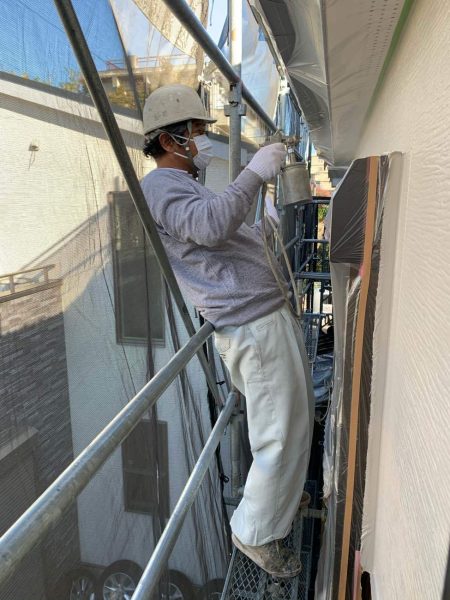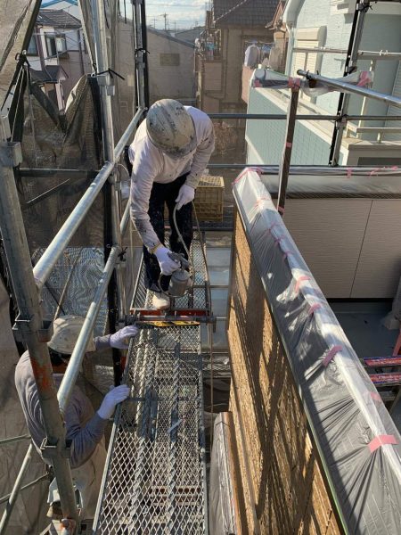 足場を組みシートをかけて塗装工事に入ります。次の工程は高圧洗浄です。高圧洗浄をしっかりやらないと年数が経過した後に塗膜の剥がれなどの原因になるためしっかりと行います。