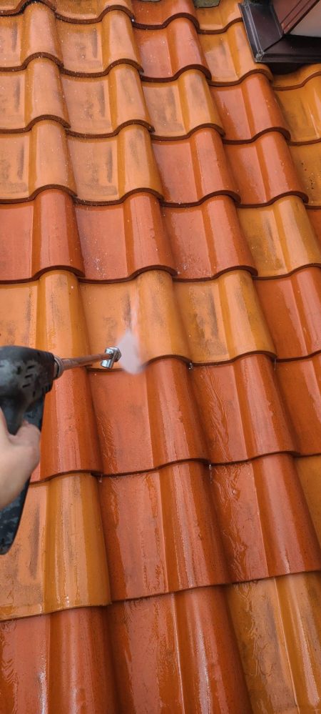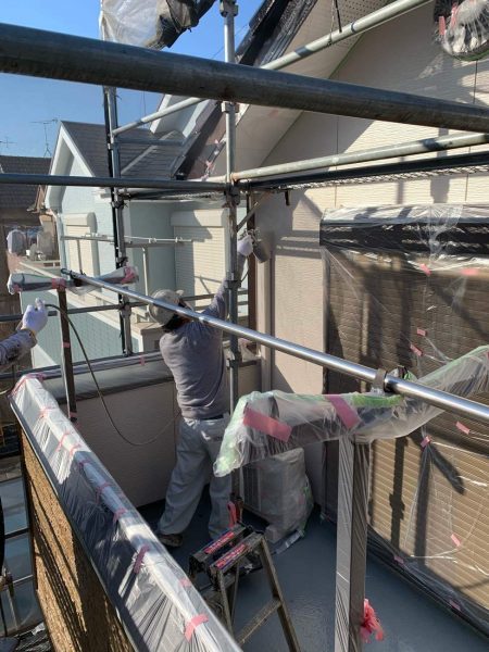埼玉県三郷市M様邸外壁屋根塗装工事は上塗りまで完了し数日間の養生期間を得てフッ素系光触媒コーテイング工事を行っています。