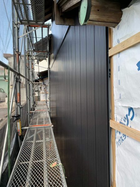 外壁工事中です。スタイリッシュな黒の落ち着いた印象の建物になります。仕上がりが楽しみです。