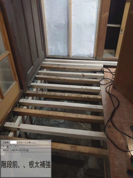 埼玉県三郷市Y様邸はぶかぶかしていた床の補修工事を行いました。大工工事で根太を補強しています。床、解体、根太増し締め、根太補強(家具等)、消毒を行いました。