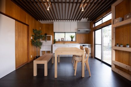 天井格子がお洒落な空間を演出しました。キッチンの位置を移動し、天井を造作しモダンで美しいお部屋に生まれ変わりました。イケヤの重厚感あるダイニングテーブルと上下に稼働するワークテーブルで趣味を楽しんでいただけます。天井格子は見せる天井としてオシャレな空間を演出しています【大塚DESIGN】