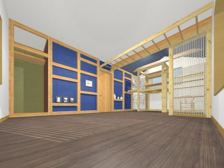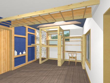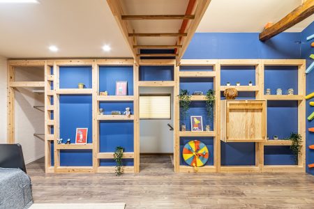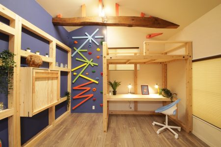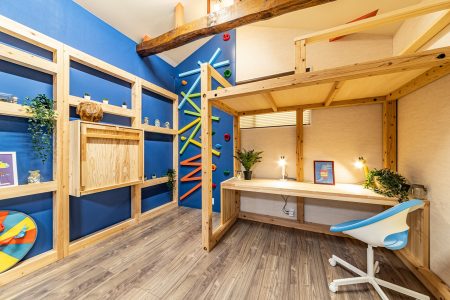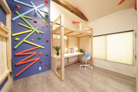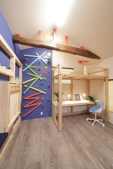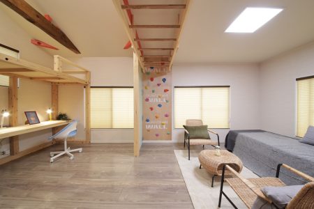 ■2F寝室は造作家具でテレワークができるよう改修しました。ボルダリングや雲梯など遊びの要素を取り入れました。