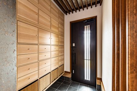 大容量のシューズラックと天然木の手摺格子。イケヤのカラックスを活用した大容量のシューラック、天然木を使った飾り格子を手摺として使えるようになりました。