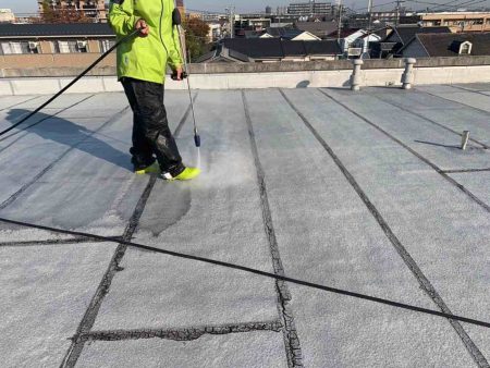 まずは屋上を洗浄しています。安全第一で工事を行います。