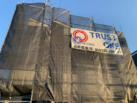 足場をたててシートをつけ、看板シートをつけて工事に入ります。明日より高圧洗浄工事を行います。