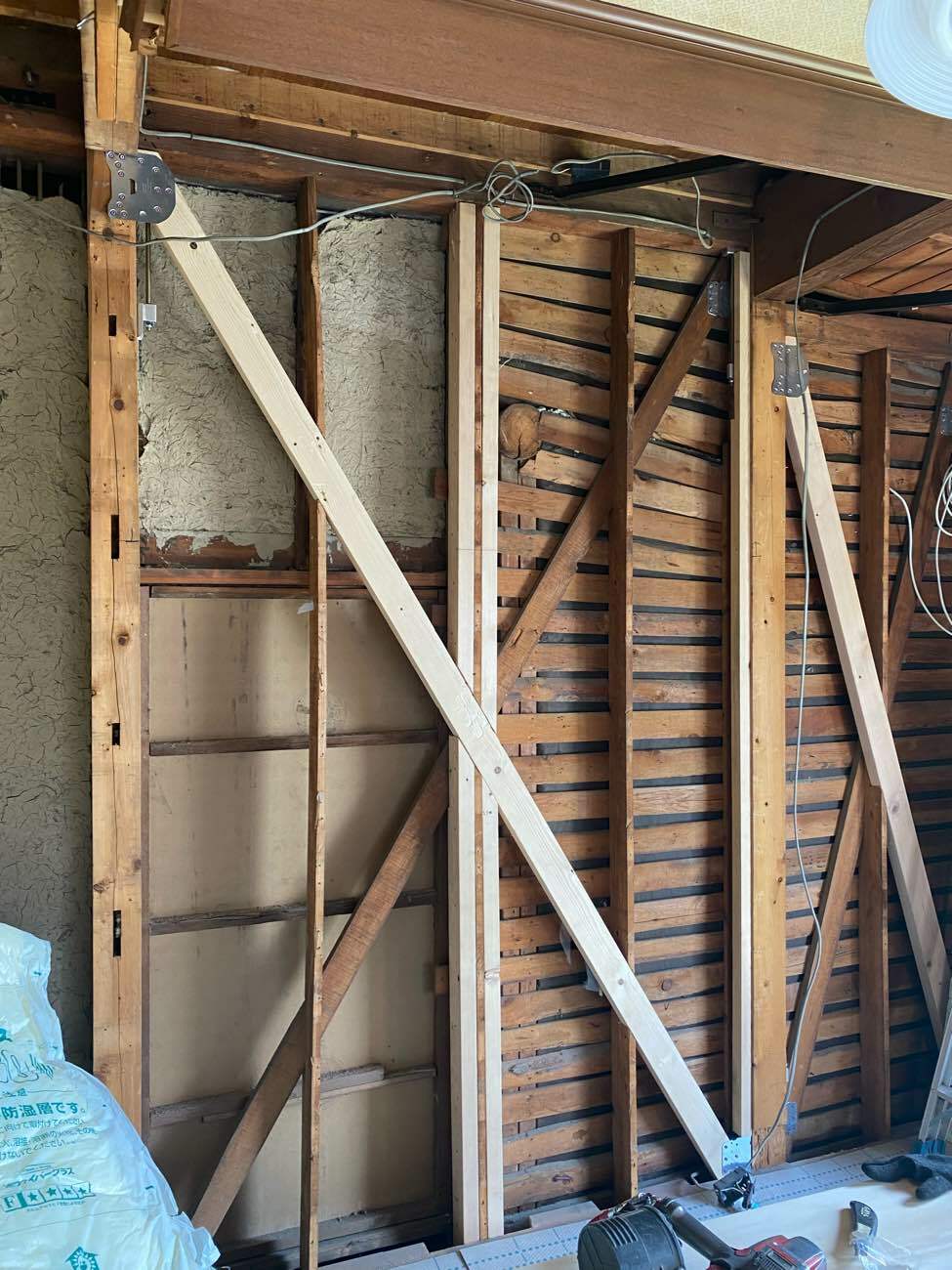 壁を補強したり、基礎のクラックを補修したり、重い屋根をふき替えてガルバリウム鋼板などの軽い屋根にしたりなどやることはいろいろとありますが、コストパフォーマンスが高いのは壁の補強と思います。柱と柱の間に筋交いを入れ金物で補強したり、構造用合板、耐震壁を入れて壁をつくり地震に対して倒壊を防ぐよう強化します(松井産業ではこの工事が一番多いです)。