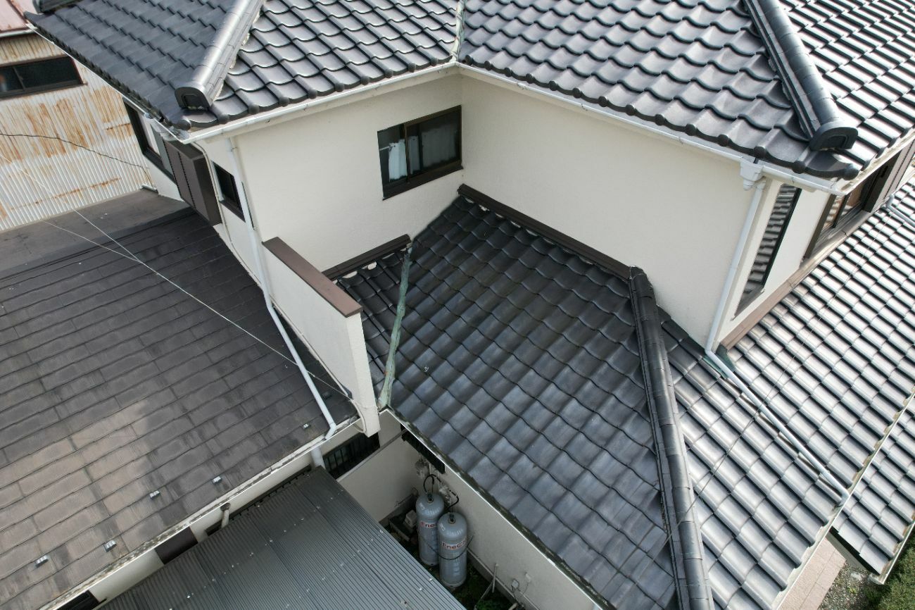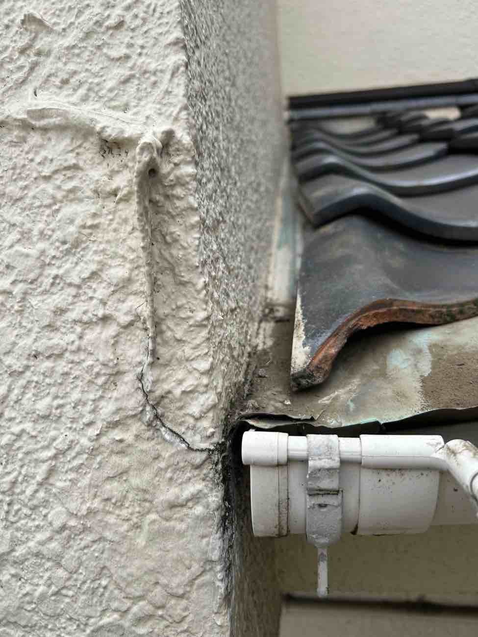 1階トイレの窓枠から大雨、打ち付けるような雨の時に雨漏れがするとご相談がありました。数年前に他社で塗装をしたとのことでしたがなおらなかったとのこと。外から見てみると下屋瓦屋根と、屋根と壁の取り合い部分がありました。雨漏れの急所部分でしたので、取り合い部分を補強(水返し板金施工)して様子をみることにしました。