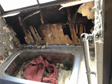 壁が一部なくなっていました。長い経年の劣化とサッシュ廻りからの漏水が原因と思われる腐食による。原因調査、下地補強も行っていきます。