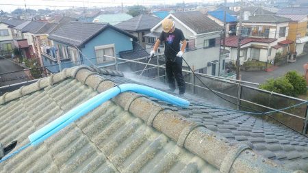 高圧洗浄にて外壁屋根の汚れを落としました。洗浄が不十分だと数年で塗装が剥がれてしまうこともあるので注意が必要です。しっかりと洗浄を行いました。この後シール工事を行います。