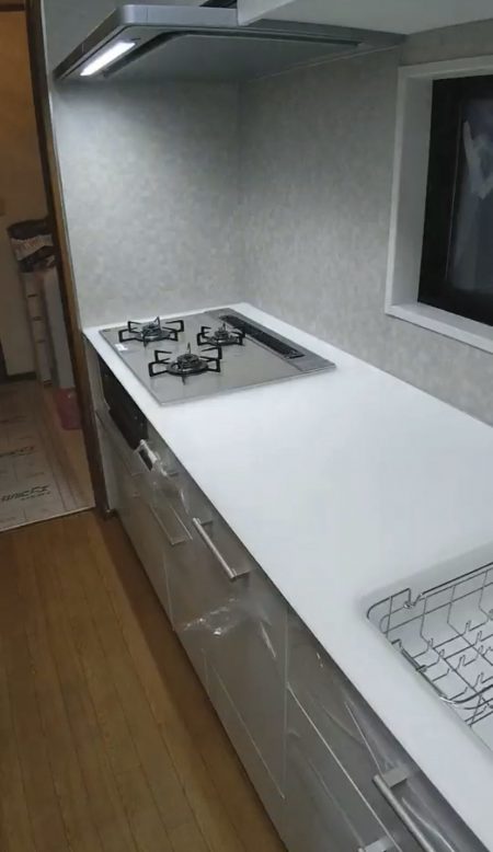 上塗りが完了し塗装後のチェックをしています。大事なことで職人任せにせず人のやることですのでチェックしダメなところは改善することが大事です。また内部工事も進行中でキッチンも取り付きました。