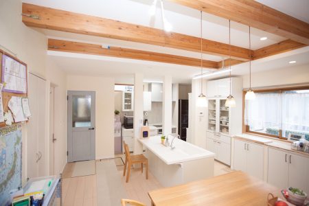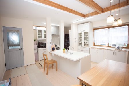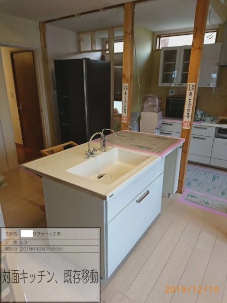 間取りの変更、新規キッチン、既存キッチンの移動、既存柱の撤去による耐震補強壁の新規取付を行いました。