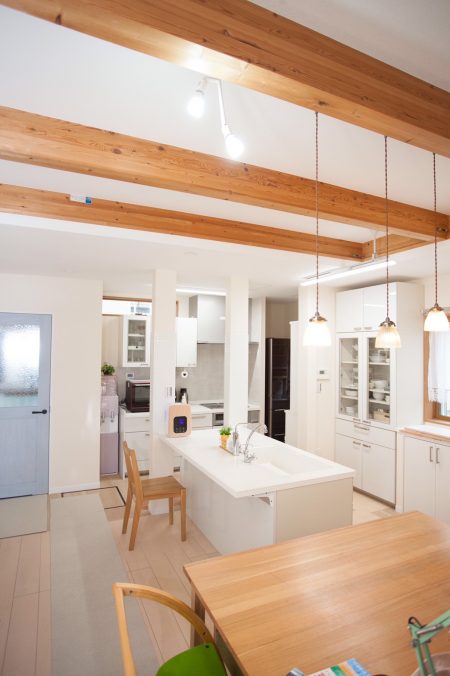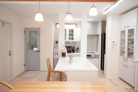 既存のキッチンを解体した洗面所・風呂のスペースに移動、シンクも中央に持ってくることでカフェ風のナチュラルなイメージになりました。