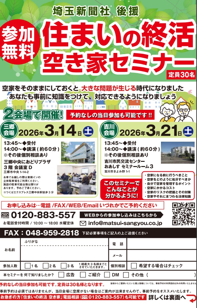 「先送りにできない問題」を「今から備える安心」へ。 大正11年の創業以来、地域に寄り添い続けてきた松井産業が、皆さまの大切な住まいを支えます 。 三郷中央の会場で、皆さまのご来場をお待ちしております!