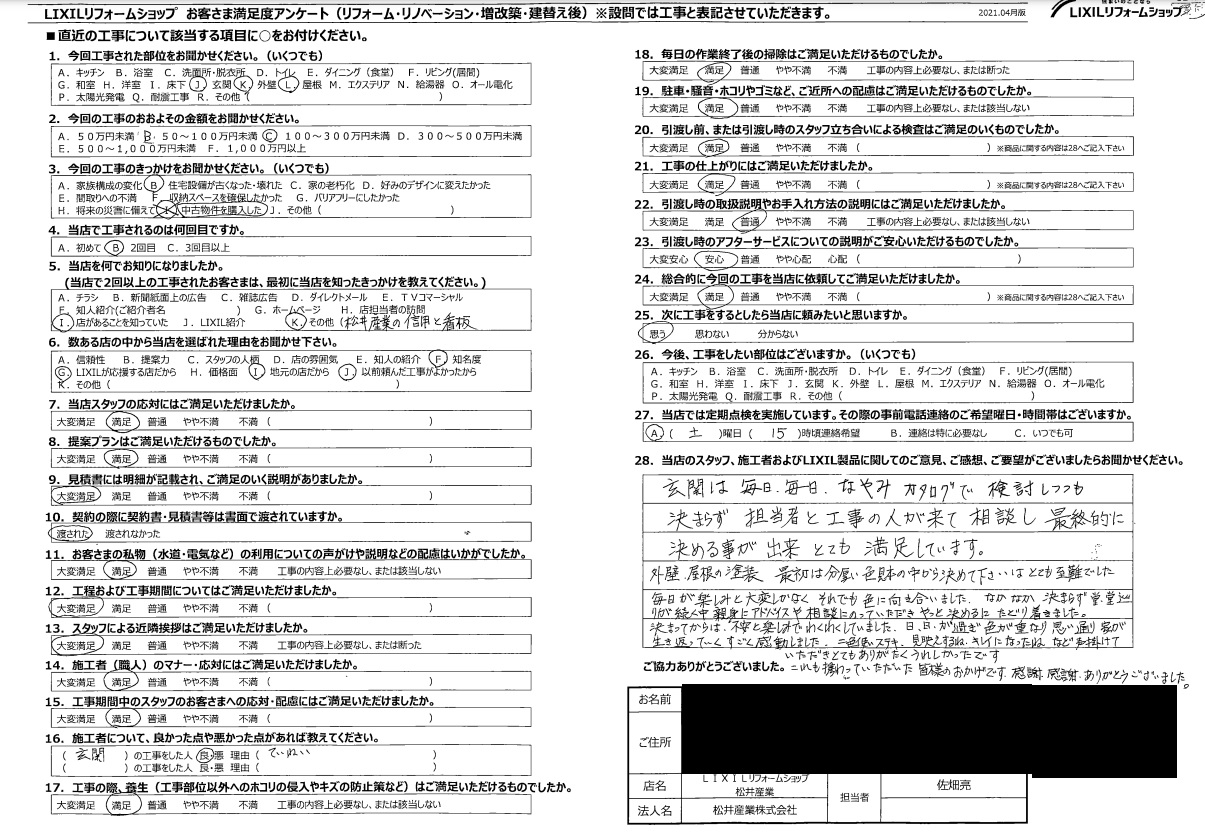 【埼玉県三郷市】K様邸玄関改修外壁屋根塗装工事アンケート「感謝感謝ありがとうございます」