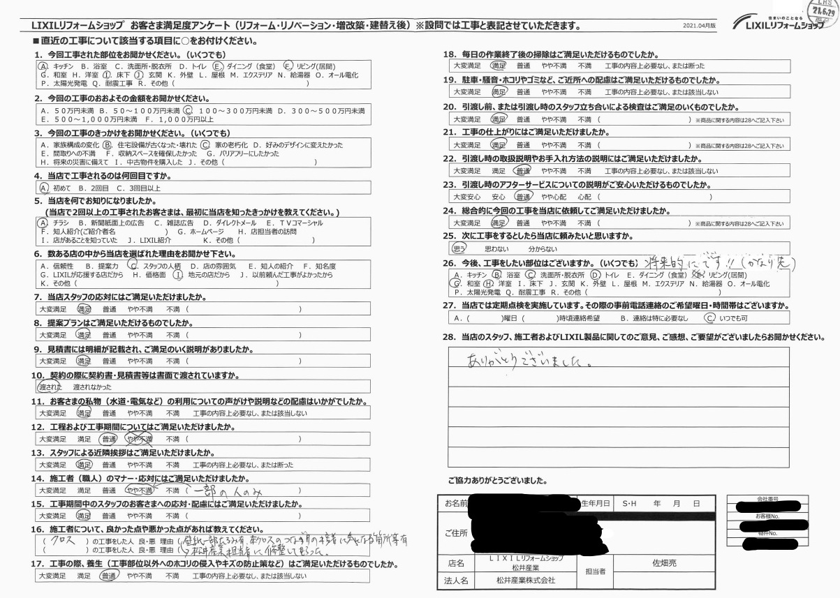 埼玉県三郷市M様邸キッチン交換工事のアンケートです。クリナップラクエラ 大変お喜びいただけました。今後ともよろしくお願いいたします。
