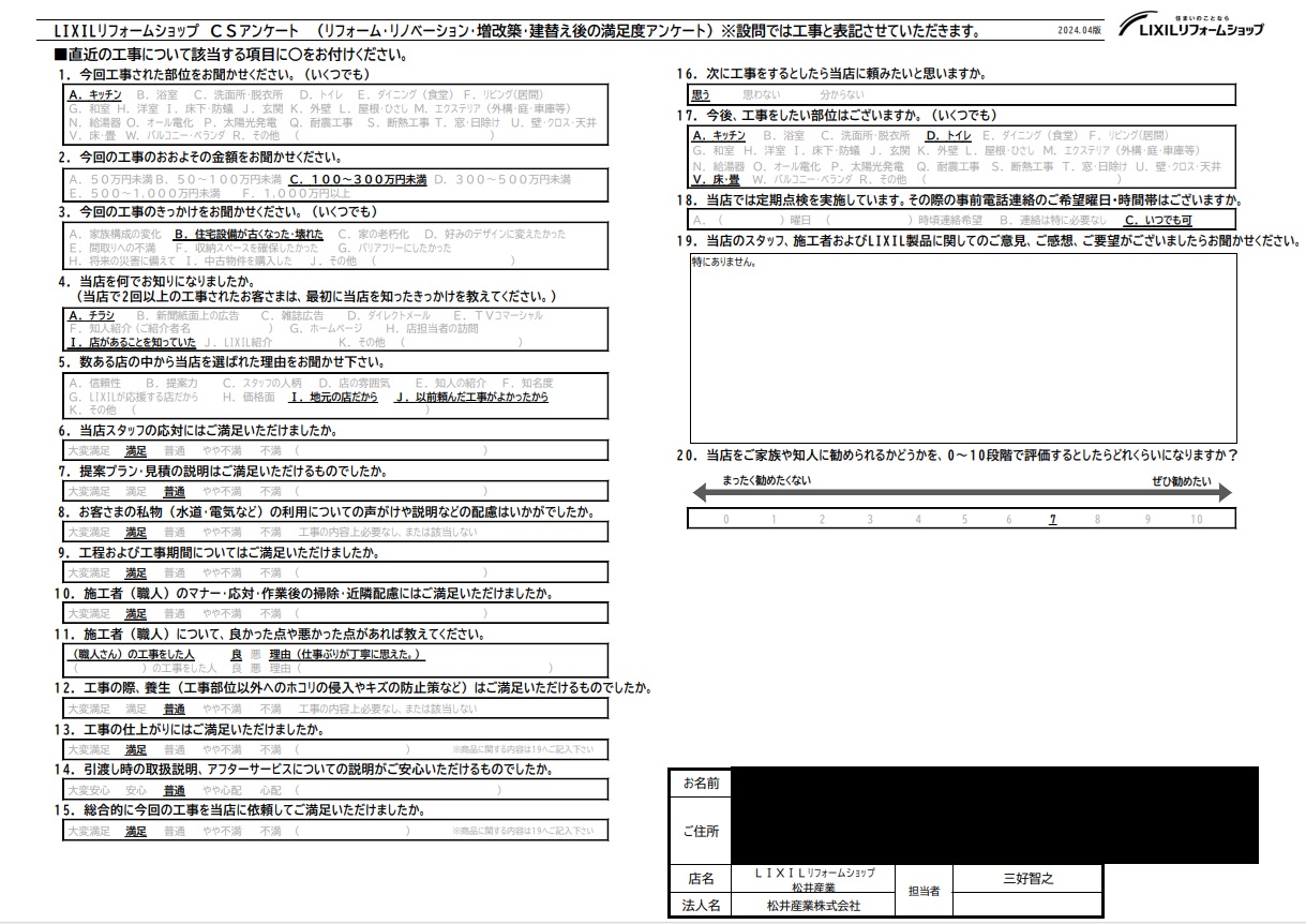 埼玉県三郷市M様邸キッチン交換工事アンケートです。また松井産業にて仕事を頼みたいとおっしゃっていただきました。