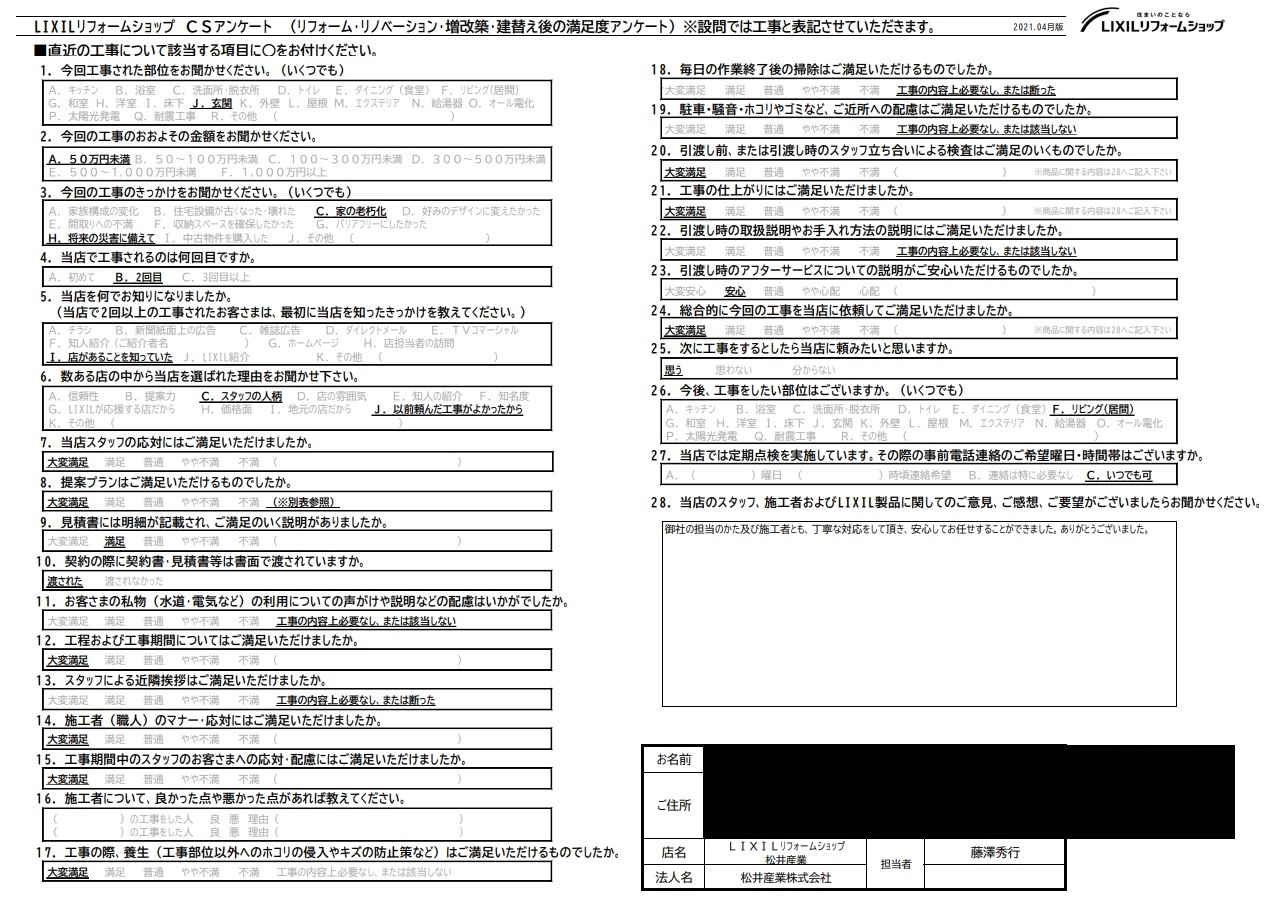 埼玉県三郷市H様邸玄関工事後のアンケートをいただきました。