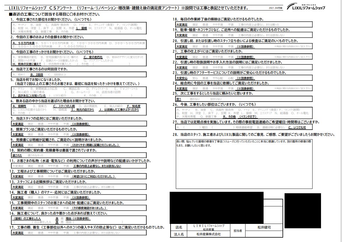 「長年悩んでいた屋根の補修を丁寧且つスムーズに行っていただいたことに本当に感謝しています。別の箇所の修繕の際にもまたお願いしたいと思います」