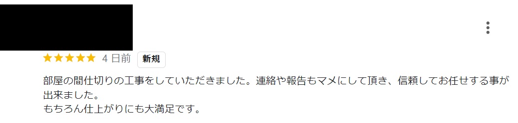 部屋の間仕切りの工事をしていただきました。連絡や報告もマメにして頂き、信頼してお任せする事が出来ました。