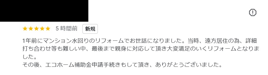 「1年前にマンション水回りのリフォームでお世話になりました。当時、遠方居住の為詳細打ち合わせ等も難しい中、最後まで親身に対応して頂き大変満足のいくリフォームとなりました。その後、エコホーム補助金申請手続きもして頂き、ありがとうございました」