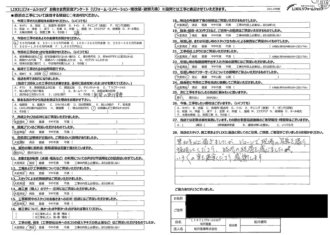 「築40年が過ぎましたがドローンで現場の写真を撮り説明してくださり時の経過を感じました。いろいろな案をくださり感謝します」