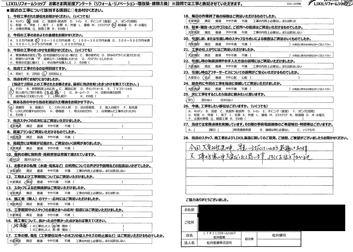 埼玉県吉川市K様邸給湯器交換工事のアンケートをいただきました。