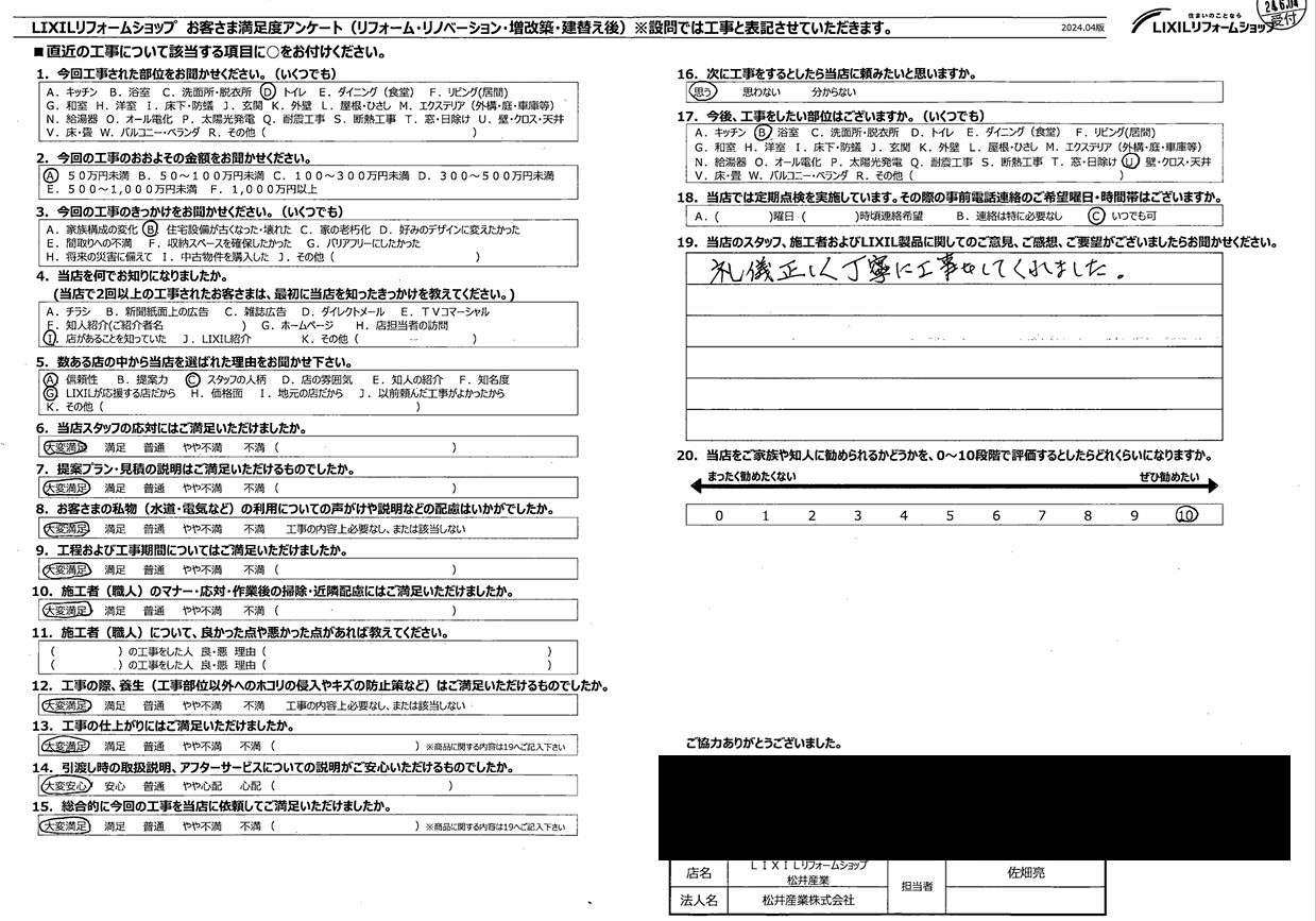 【埼玉県吉川市】Y様邸トイレ交換工事が完了しアンケ―トをいただきました「礼儀正しく丁寧に仕事をしてくれた」