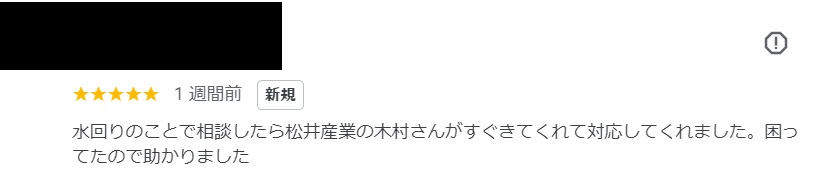 「水回りのことで相談したら松井産業の木村さんがすぐきてくれて対応してくれました。困っていたので助かりました」