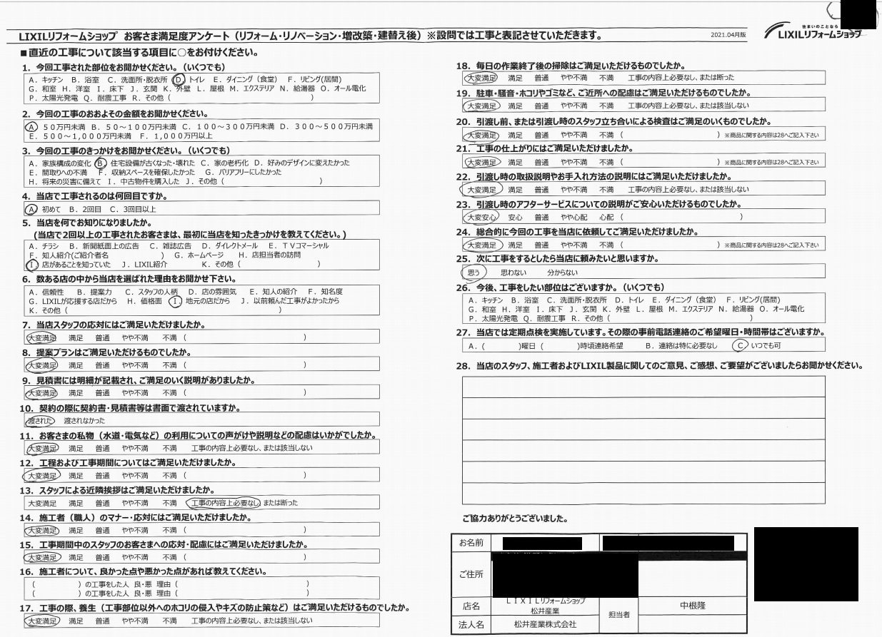 埼玉県吉川市S様邸トイレ改修工事のアンケートをいただきました。