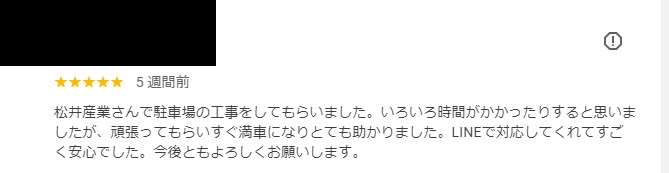 松井産業さんで駐車場の工事をしてもらいました。いろいろ時間がかかったりすると思いましたが、頑張ってもらいすぐ満車になりとても助かりました。LINEで対応してくれてすごく安心でした。今後ともよろしくお願いします。