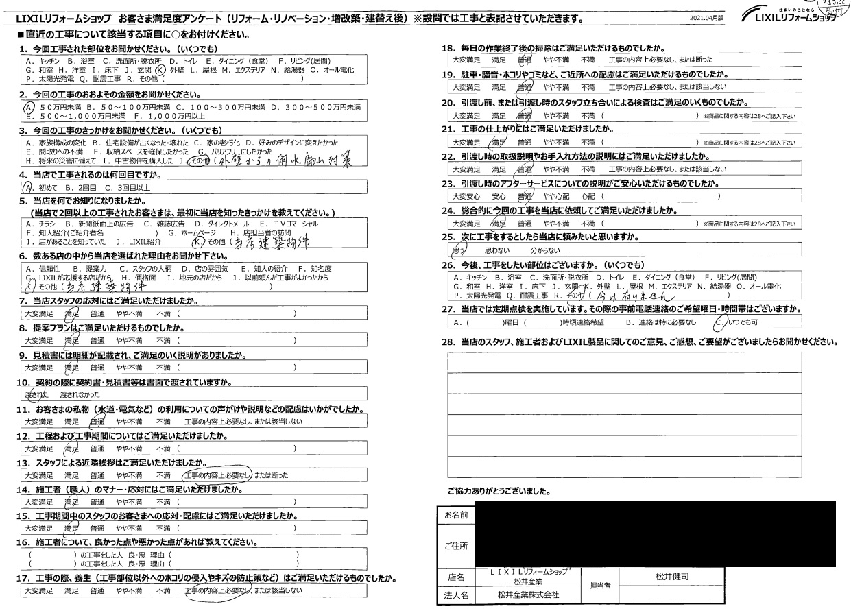埼玉県北葛飾郡松伏町O様邸雨漏れ補修工事アンケートをいただきました。