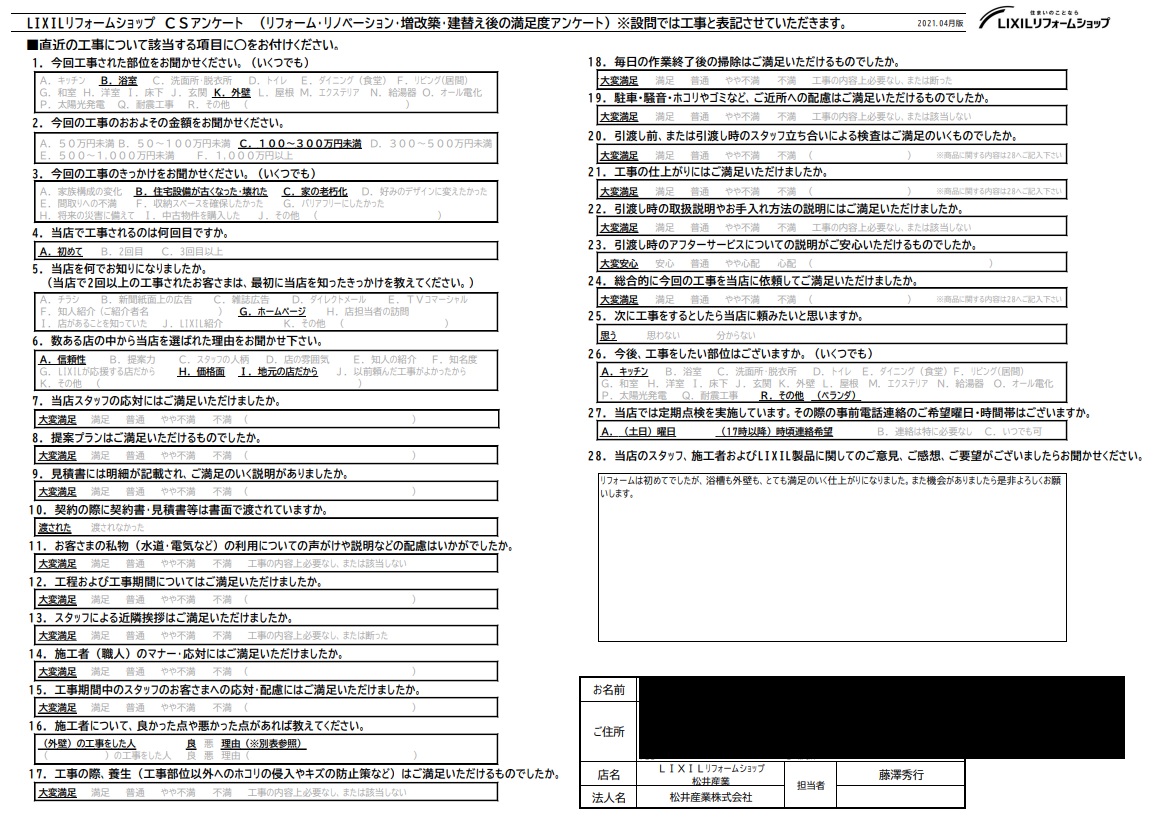 埼玉県三郷市O様邸外壁屋根塗装、水回り工事は完了しアンケートをいただきました