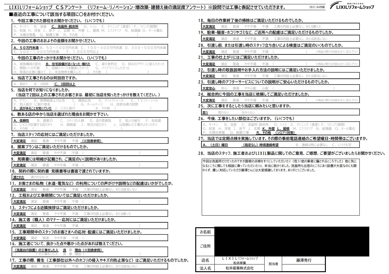 【埼玉県三郷市】Y様邸洗面化粧台交換工事アンケート「大変感謝しております」
