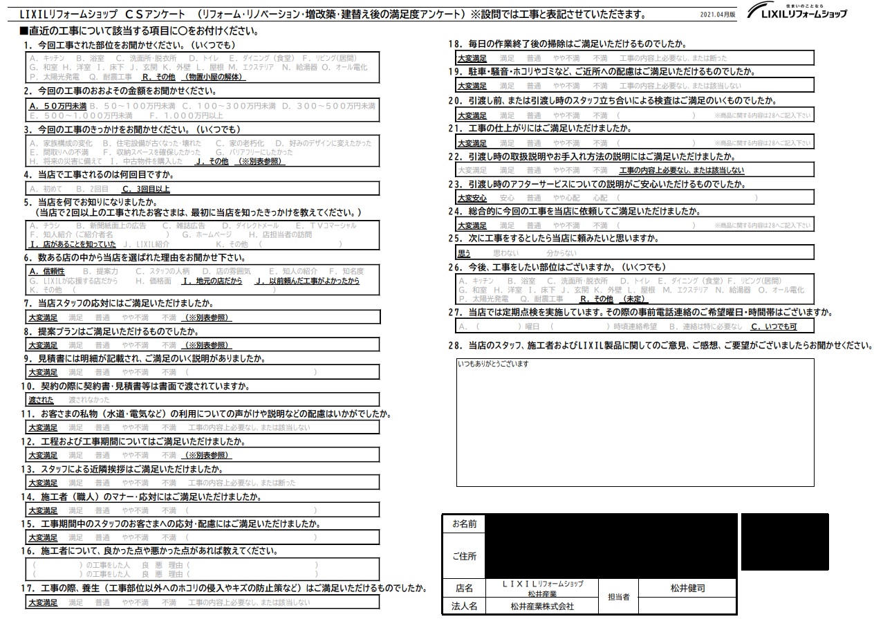 【埼玉県三郷市】S様邸物置解体工事アンケート「全てのスタッフが礼儀正しく気持ちの良い施工をしてくれたと思う」