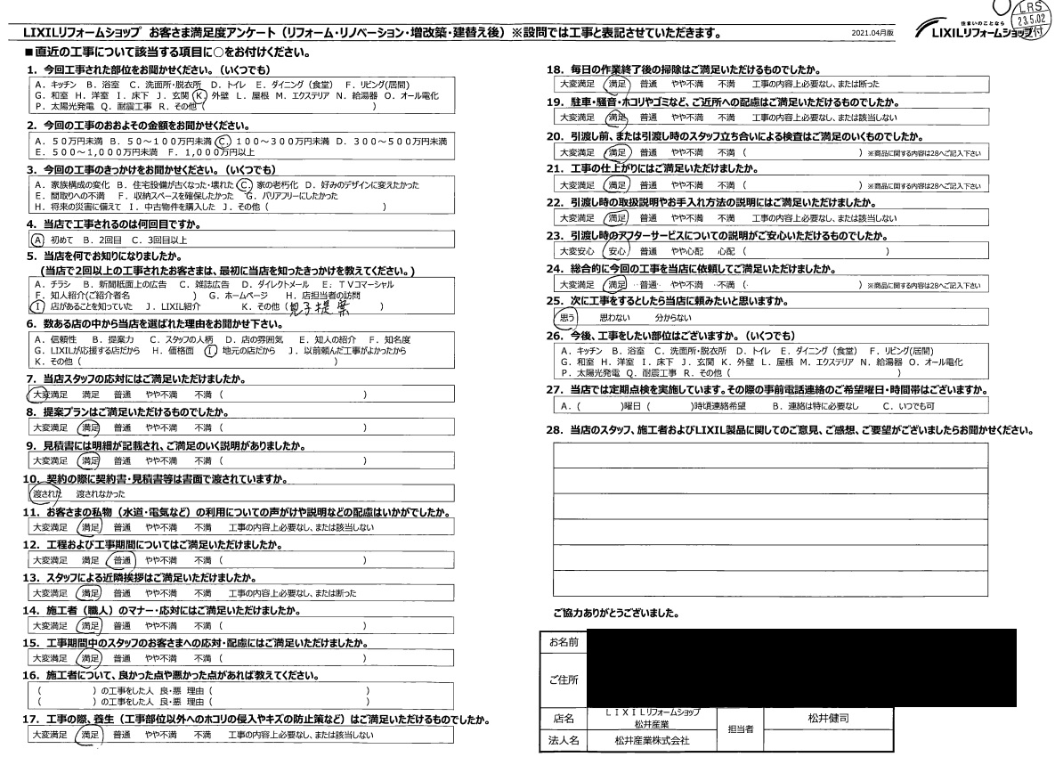 【埼玉県北葛飾郡松伏町】T様邸外壁塗装工事後のアンケートをいただきました。