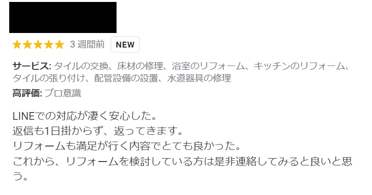 「LINEでの対応が凄く安心した。返信も1日掛からず、返ってきます。リフォームも満足が行く内容でとても良かった。
