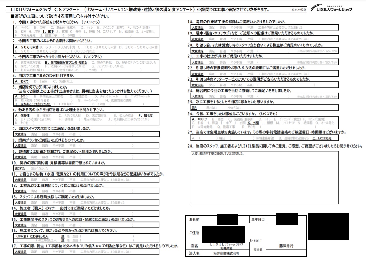 埼玉県吉川市Y様邸キッチン床配管修繕工事アンケートをいただきました。大変親切で丁寧に対処していただきましたとご回答いただきました。ありがとうございます。今後ともよろしくお願いいたします。