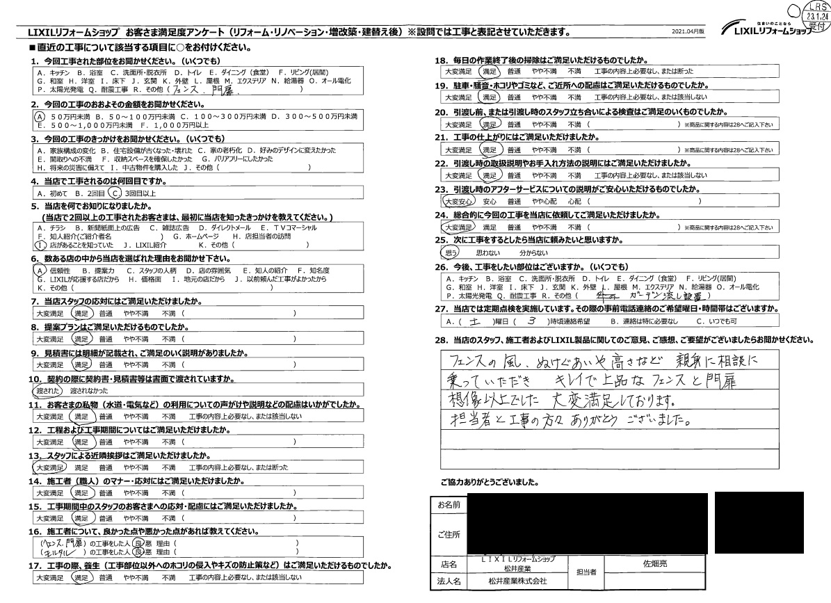 埼玉県三郷市K様邸外構フェンス工事が完了しアンケートをいただきました。