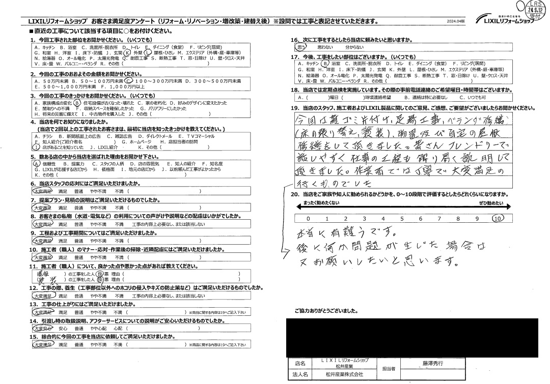皆さんフレンドリーで話しやすく仕事の工程もわかりやすく説明していただきました。作業面では丁寧で大変満足の行くものでした。本当にありがとうです。後に何か問題が生じた場合はまたお願いしたいと思います。