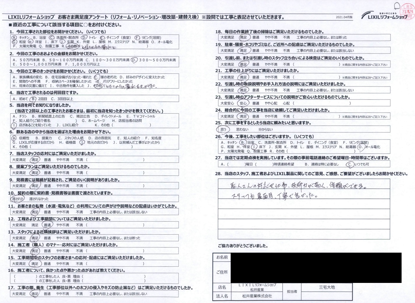 埼玉県三郷市M様邸マンション内装水回り工事が完了しアンケートをいただきました。