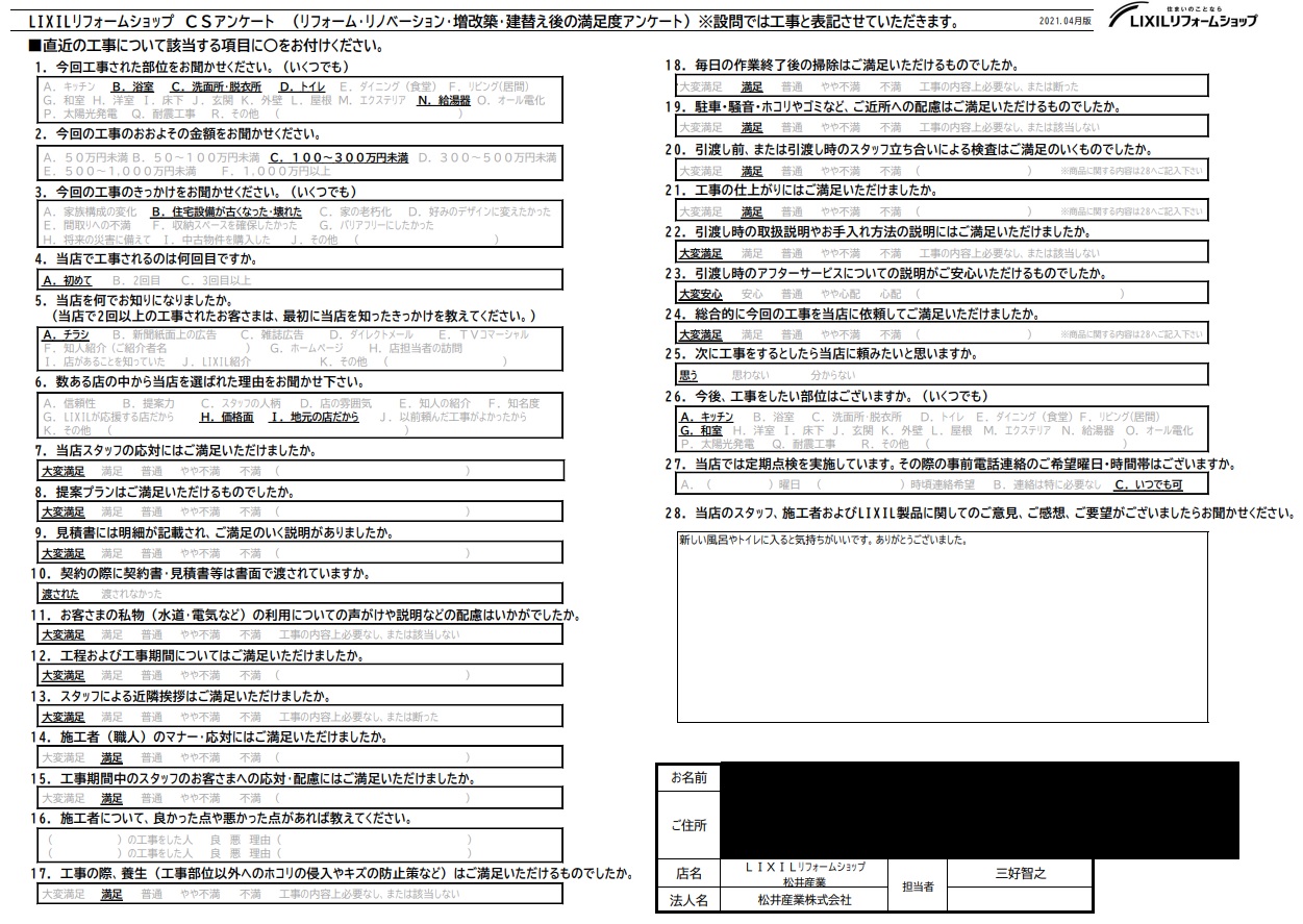 埼玉県吉川市S様邸水回り一式工事が完了しアンケートをいただきました。
