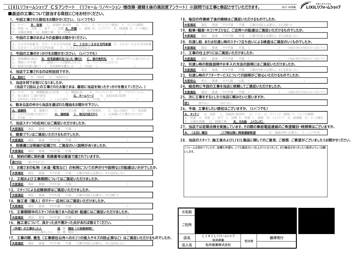 「リフォームは初めてでしたが、浴槽も外壁も、とても満足のいく仕上がりになりました。また機会がありましたら是非よろしくお願いします。」