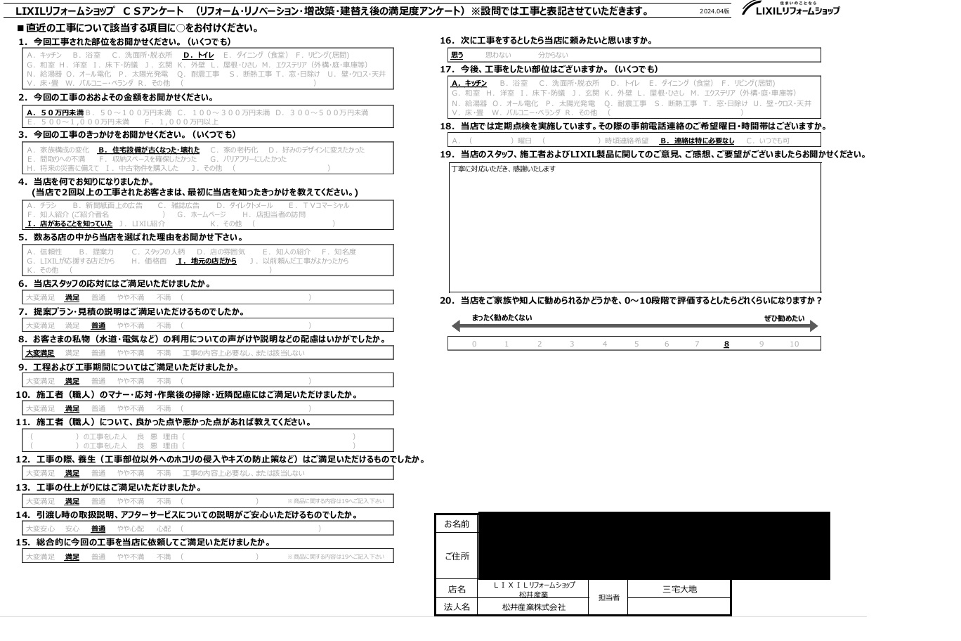 埼玉県三郷市T様邸トイレ工事が完了しアンケートをいただきました。「丁寧に対応していただき感謝しています」