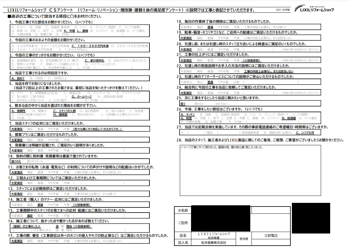 埼玉県吉川市S様邸外壁屋根塗装工事は完了しお客様よりアンケートをいただきました。