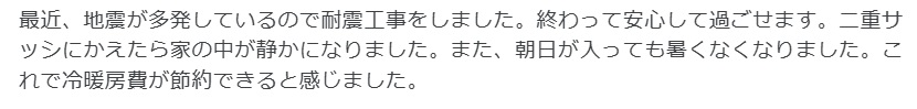 最近、地震が多発しているので耐震工事をしました。終わって安心して過ごせます。二重サッシにかえたら家の中が静かになりました。また、朝日が入っても暑くなくなりました。これで冷暖房費が節約できると感じました。
